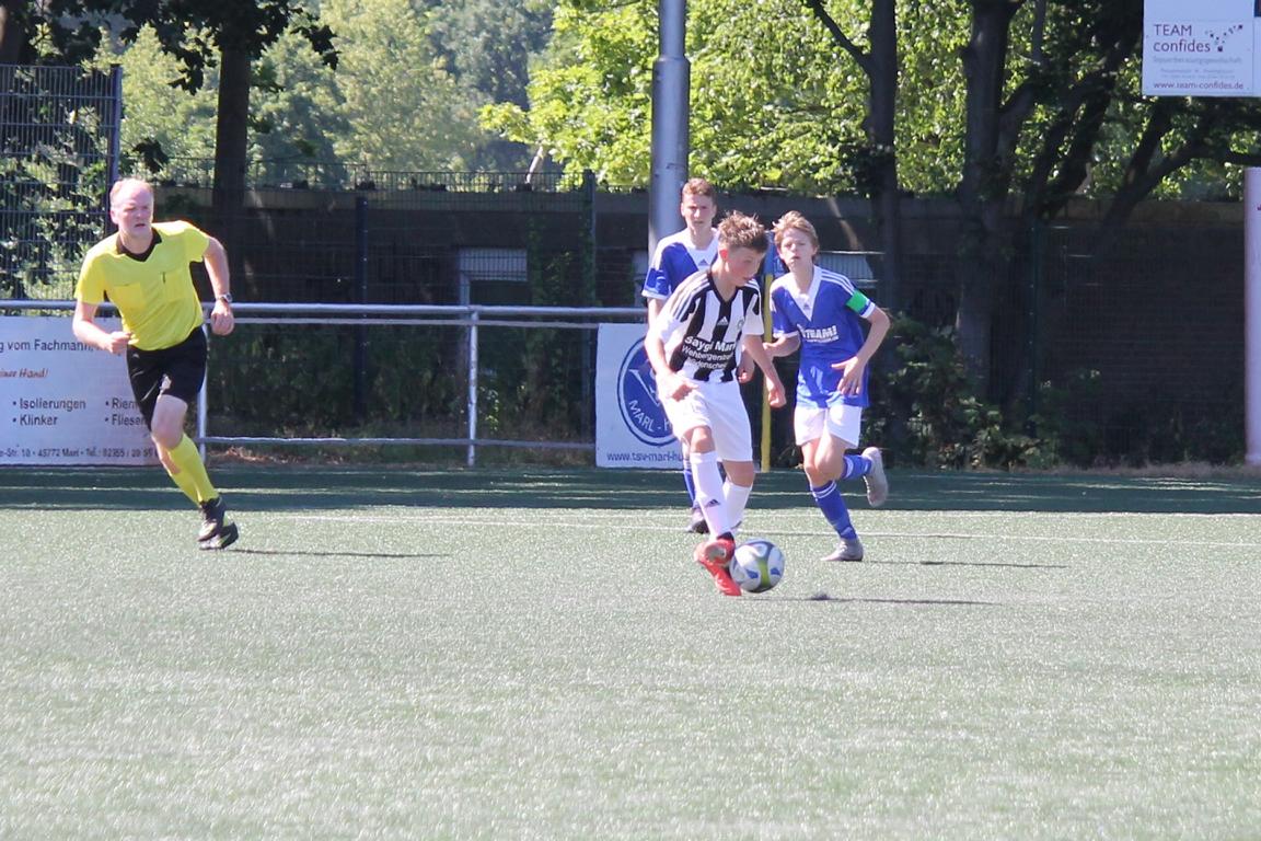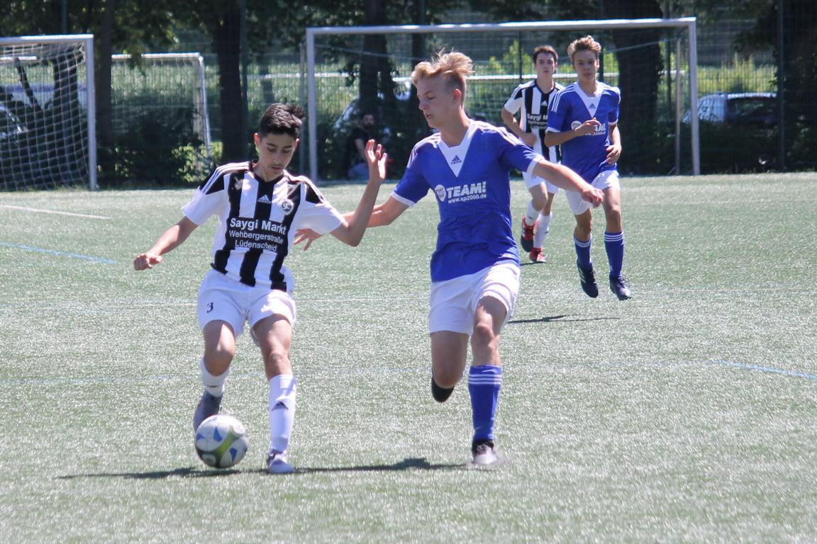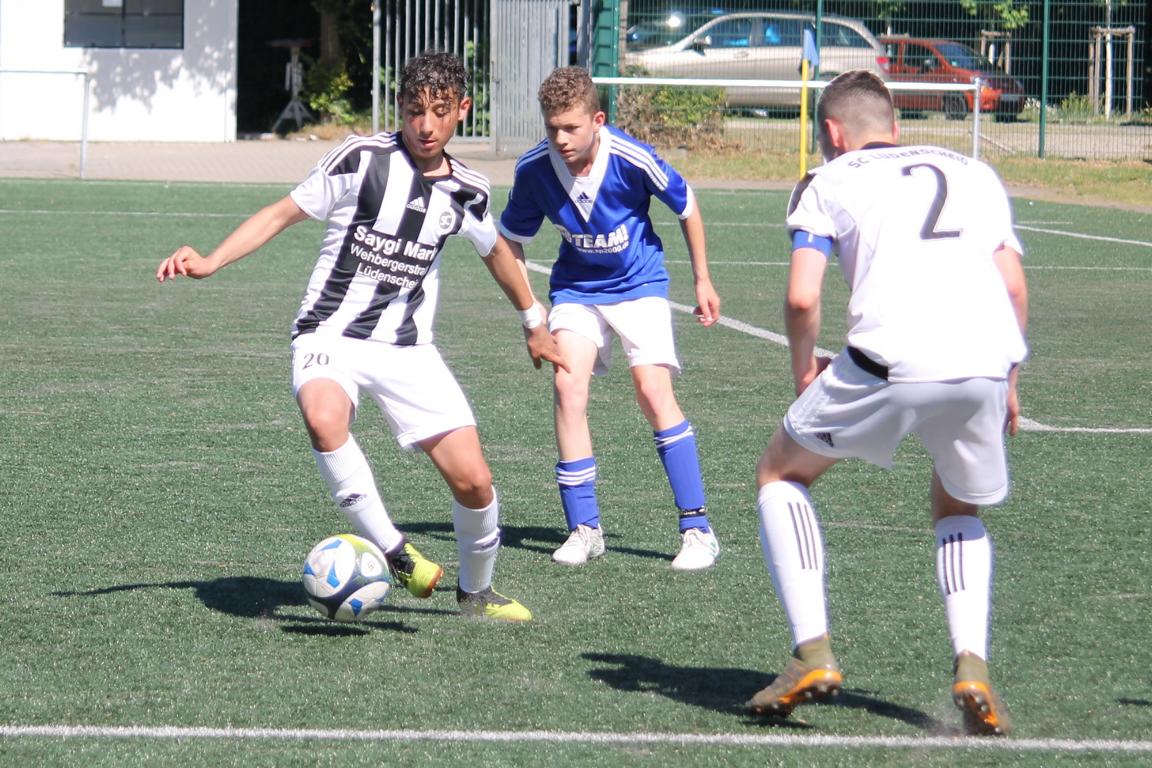 Sportlich fair gestalteten die C1-Jugendlichen um Trainer Hassan El Mourabit das letzte Relegationsspiel auf dem Toaster der Anlage in Marl-Hüls. Bei 45 Grad gemessen auf der dunklen Kunstrasenfläche brachten die angeschlagenen Spieler ihre letzten Reserven ein und erspielten sich ein Remis gegen die technisch starken Jungjahrgangspieler aus Marl. Sean Ogonda hielt die Sportcluberer lange durch etliche Paraden im Spiel. Nach vorn ging nur sporadisch etwas. Bereits vor der Halbzeitpause musste Sascha Muncan angeschlagen vom Feld, in der Pause musste Innenverteidiger Pascal Reder die Segel streichen. Beinah unerwartet erzielten die Lüdenscheider durch Sturmspitze Christos Triadafillides in der Mitte der zweiten Halbzeit durch einen sehenswerten Treffer die Führung. Marl-Hüls machte auf und kam über die rechte Seite vors Tor. Der Ausgleich war zwar ärgerlich, aber mit dem Unentschieden konnten beide Mannschaften gut leben. Auf Nachfrage, warum denn die Marl-Hülser sich über den Bezirksligaerhalt gar nicht so recht freuten, erhielt das SC- Trainerteam folgende Antwort vom Co-Trainer der Gastgeber, die mit Blick auf falsch verstandene Profiallüren tief blicken ließ: „Die Jungs wissen, dass sie komplett in die Landesliga gehen, da wir mit der Mannschaft hochrücken, der Jungjahrgang wird dann zur ersten Mannschaft. Von daher war es wohl einigen Spielern egal, was mit der nachfolgenden Generation geschieht…“